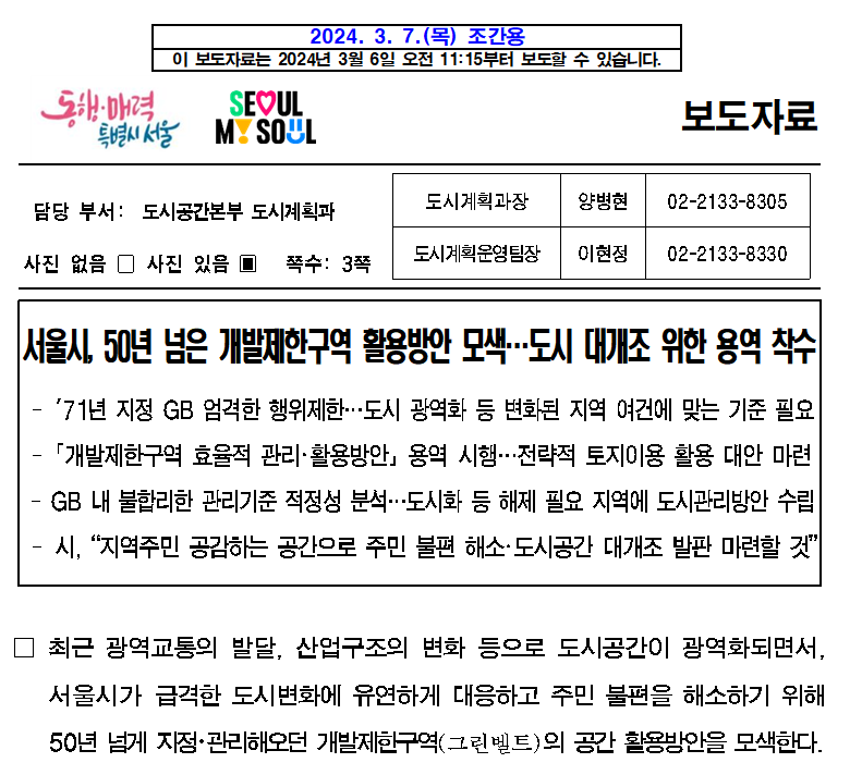 서울 그린벨트 해제 및 도시 대개조 위한 용역 착수